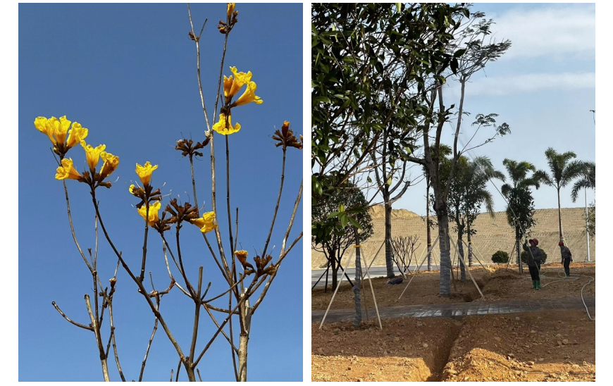 2023年3月12日,東粵環(huán)保的生產(chǎn)區(qū)域煥然一新。生產(chǎn)樓大門前的狐尾椰子樹,搖曳生姿,獨領(lǐng)風騷;一旁的桂花樹,沉靜內(nèi)斂,毫不遜色;與其相陪襯的還有灰莉球、黃金葉球等,象征著樸素自然、清潔純凈。最引人矚目的莫過于黃花風鈴木,黃色的花蕾映照綠樹婆娑的身影,更顯生機活力,象征感恩的寓意。