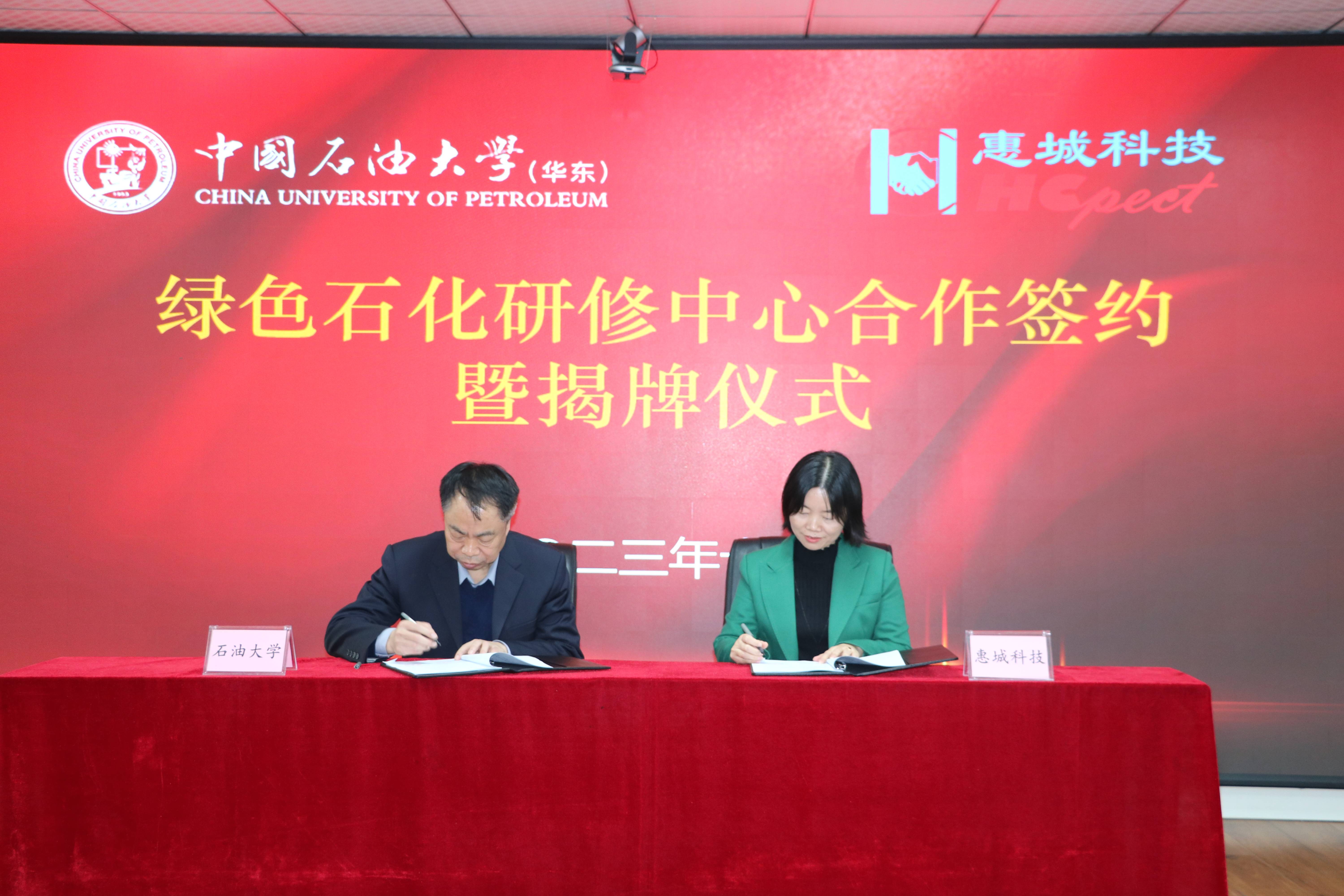 會(huì)議中,主持人首先就綠色石化研修中心合作背景、合作開(kāi)展情況進(jìn)行了介紹,中國(guó)石油大學(xué)(華東)教育發(fā)展中心主任韓紅江、惠城環(huán)保董事長(zhǎng)葉紅代表雙方上臺(tái)簽約揭牌,并發(fā)表致辭,隨后展開(kāi)了座談交流。